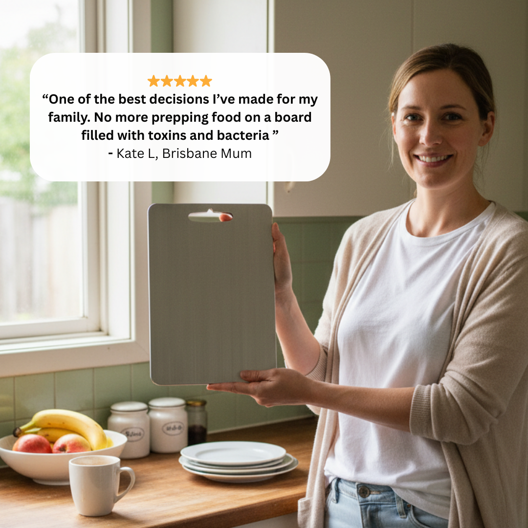 The Pura Titanium chopping board gives you a cleaner, safer way to prepare food. It’s non-porous, so it won’t hold bacteria, smells or juices like wood, and it’s completely free from plastics and toxins that can break down into your meals. The surface is gentle on your knives, easy to clean, and requires almost no maintenance, just rinse and use. Strong, hygienic and family-safe… finally, a product that’s made to last.