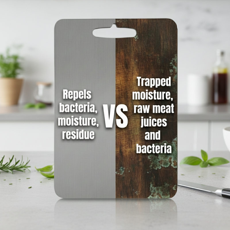 Yes. Titanium is non-porous, so it doesn’t absorb bacteria, raw meat juices, moisture or odours. Wooden boards naturally trap these inside their grain, and plastic boards shed microplastics while developing deep grooves that harbour germs. Titanium stays cleaner, safer and easier to sanitise.